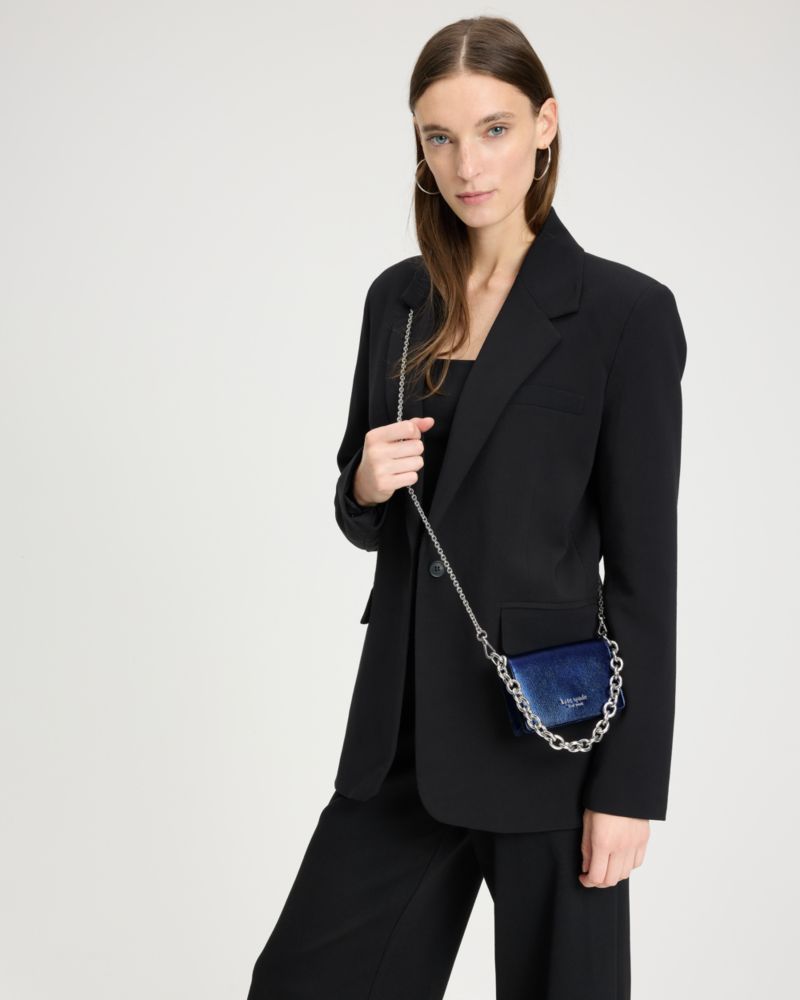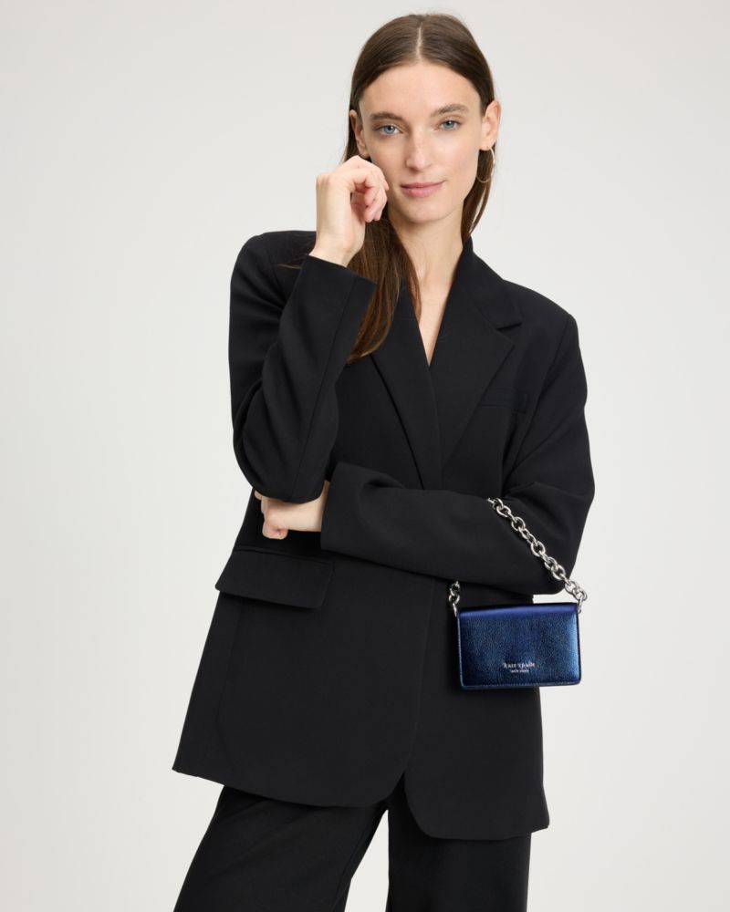 Kreditkarten, Führerschein ... unser Natasha Kartenetui zum Umhängen bietet Platz für alles, was du für einen stylishen Abend brauchst. Es besteht aus genarbtem Metallic-Leder mit Kettengriff und abnehmbarem Riemen.