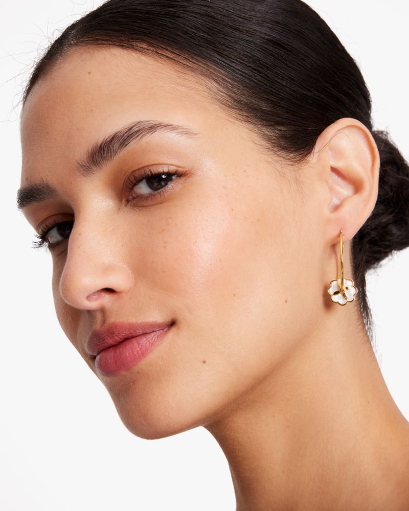 Wir haben unsere Signature-Pik als elegantes Blumenmotiv neu interpretiert. Hier ziert es diese glänzenden Creolen mit Perlmuttakzenten.