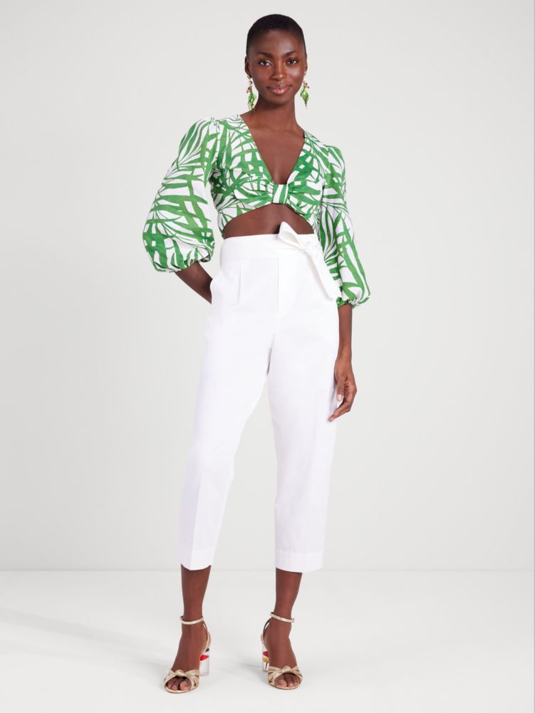 Wenn der Urlaub ruft, denk daran, auf jeden Fall dieses Crop-Top mit Palmwedel-Print und Trompe-l’oeil-Schnür-Detail auf der Vorderseite in deinen Koffer zu packen. Bon Voyage!