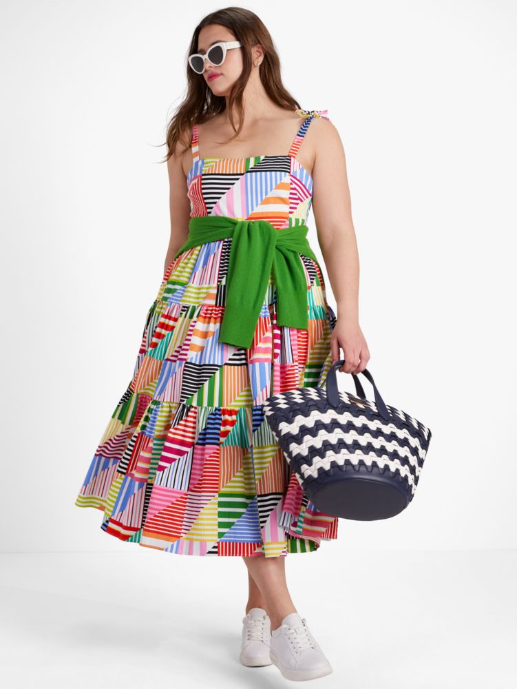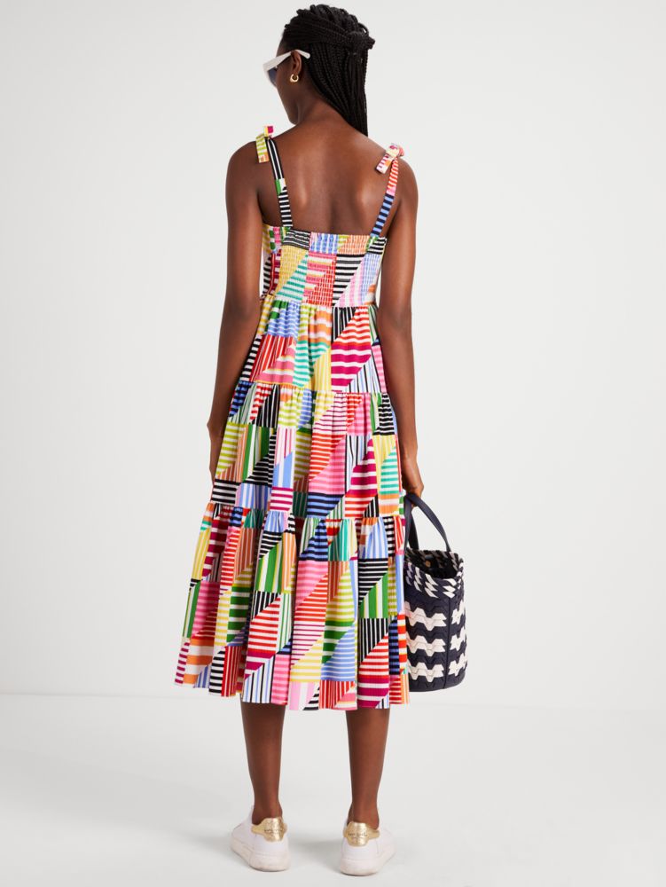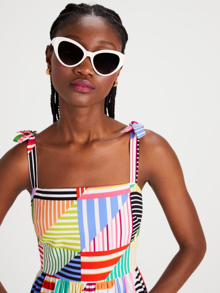 Dieses luftige Midikleid aus leichtem Seersucker mit bunten Patchwork-Streifen sorgt sofort für gute Laune – selbst bei Regenwolken.